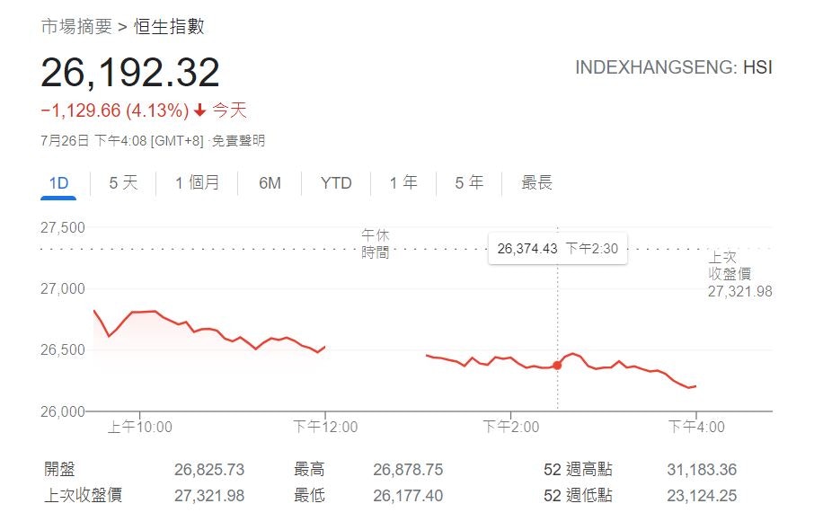 22 hours ago · 除了教育類股大跌外,港股股王騰訊因為網路音樂獨家版權問題也出現大跌,並跌破港幣500元整數關卡,收港幣490元,來到一年低點,大跌7.7%,並. Jul 27, 2021 · 港股大跌1105點科指瀉近8% 京東健康重挫22%. Jul 08, 2021 · 港股半日大跌近560點或2%,恒指中午收報27401。 若全日維持跌市,港股將錄8連跌,為2015年12月以來最長跌市。 市場繼續發酵內地當局加強中概 Jul 26, 2021 · 港股上市的網路三巨頭「atm」(阿里巴巴、騰訊、美團)等科網股26日領跌大盤,恒生指數收盤大跌1,129點,跌幅達4.13%,以26,192點作收,創2020年12月21日以來收盤新低,南向資金淨賣出63.34億港元。上證指數收跌2.34%,創一年來最大單日跌幅。 Jul 15, 2021 · 「滴滴出行」剛在美國新股上市就被北京政府重手打壓,大多數台灣人覺得事不關己,只是又一個習近平的政治緊箍咒。但是,滴滴事件導致香港股市大跌令人不安,香港是觀察中國經濟的重要窗口,更是中國向全球吸收外資最重要的臍帶,如今香港以驚人的速度與幅度緊縮,外資逃跑這個警訊絕對.